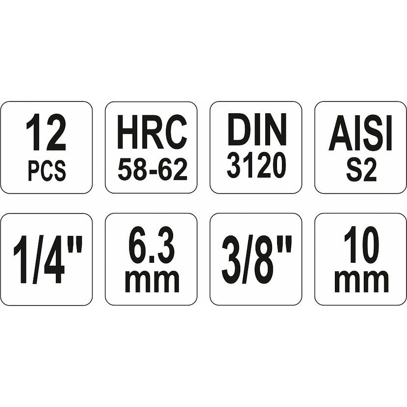 Délky bitů 37 a 48 mm, určené pro 1/4" a 3/8" ráčny. V sadě je kovový držák bitů a samotné bity T8-T55. Splňuje normu DIN 3120 pro vysoce-zatěžovatelné nástavce.