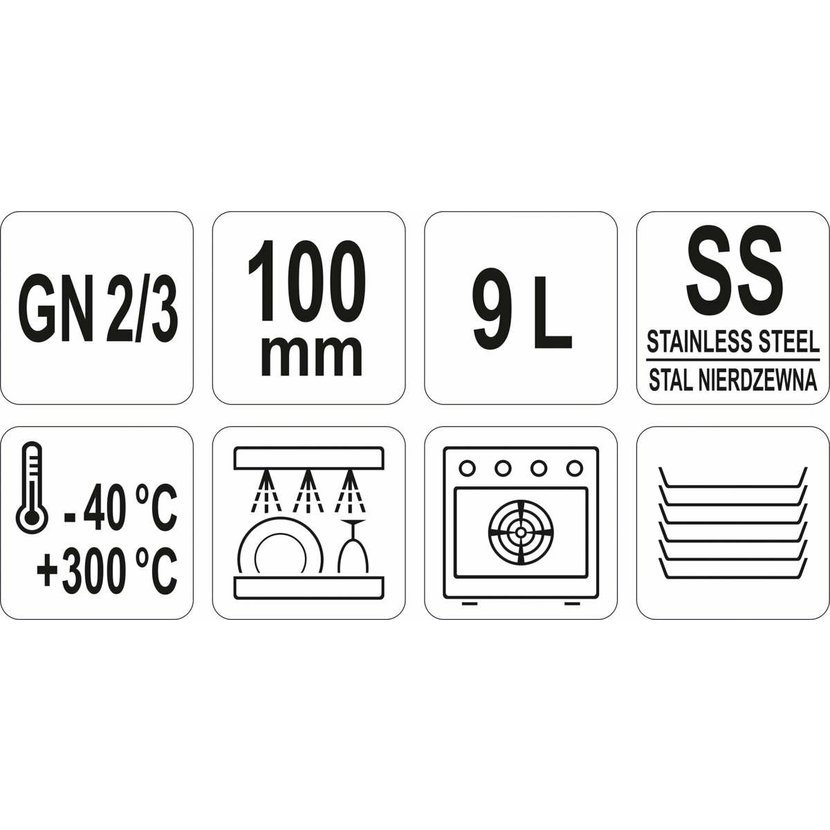 Gastronomická nerezová nádoba GN 2/3 100 mm je profesionální nádoba YATO z nerezové oceli, rozměry 2/3, 100 mm, objem 6,9 l.