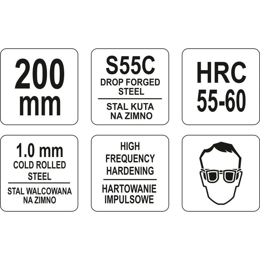 Zhotovené z S55C oceli 55-60 HRC. Oplastované rukpojeti zabezpečují míru komfortu při práci.