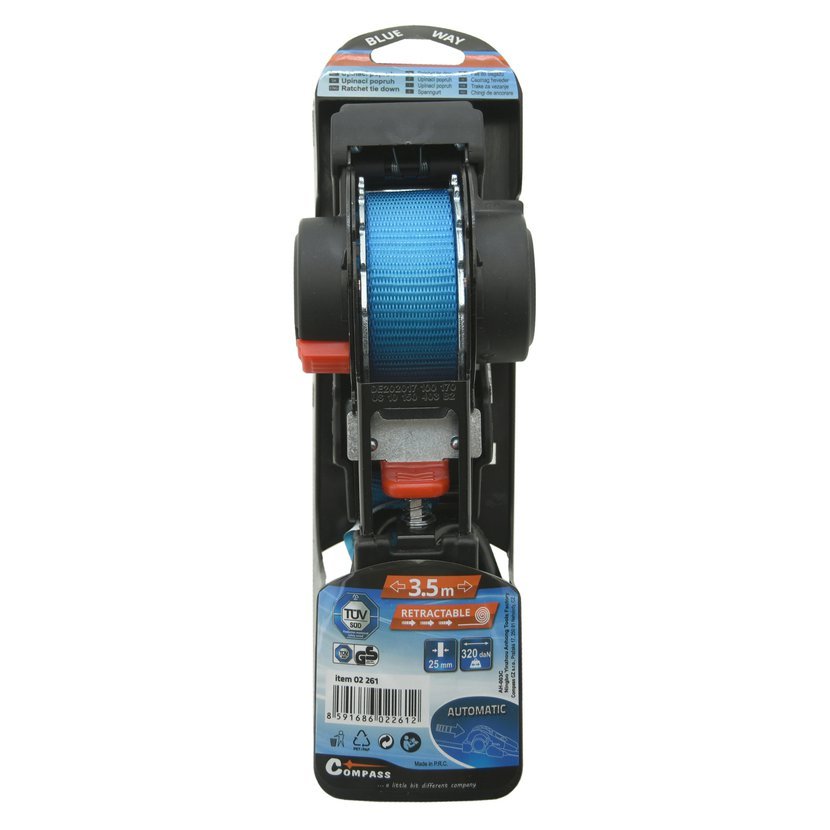 Samonavíjecí upínací popruh vysoké kvality s homologací TÜV/GS, k zajištění předmětů, zavazadel, nebo nákladu.