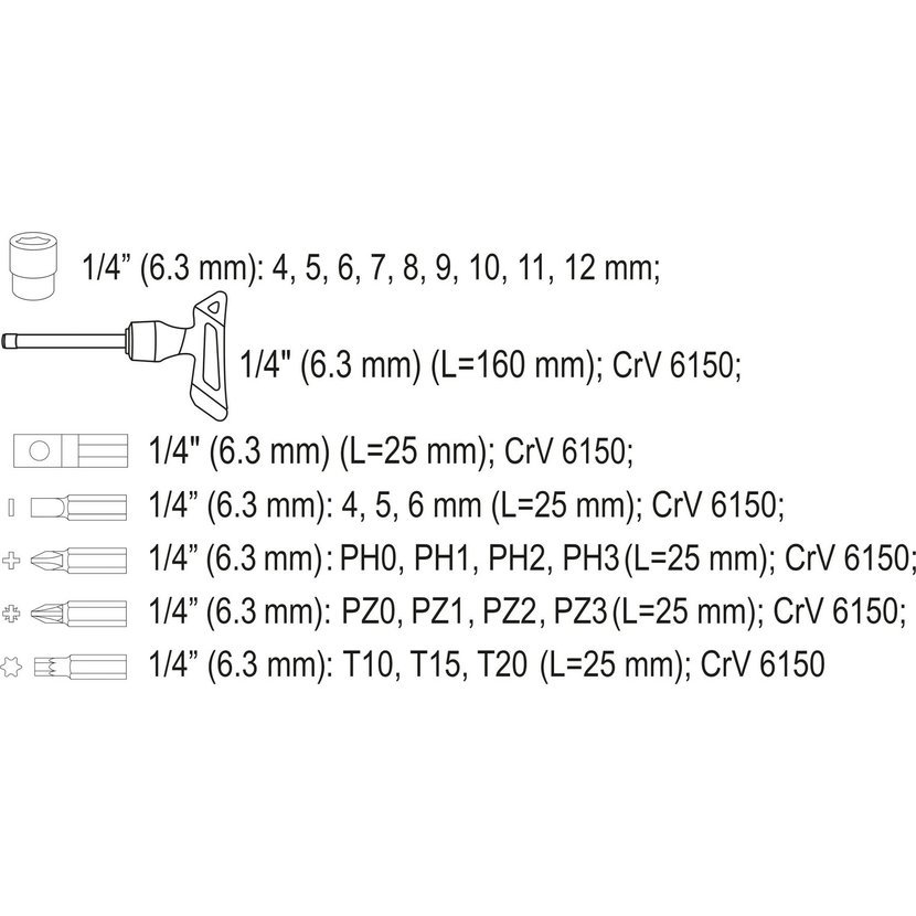 • 9x nástavec 1/4": 4; 5; 6; 7; 8; 9; 10; 11; 12 mm