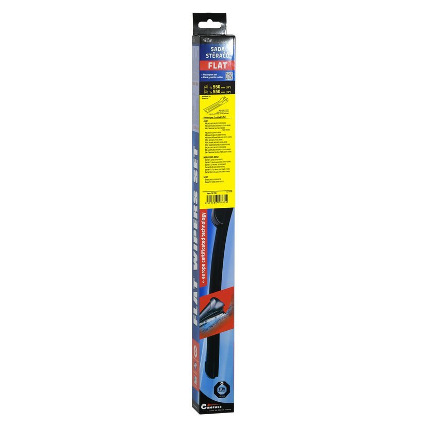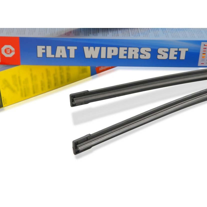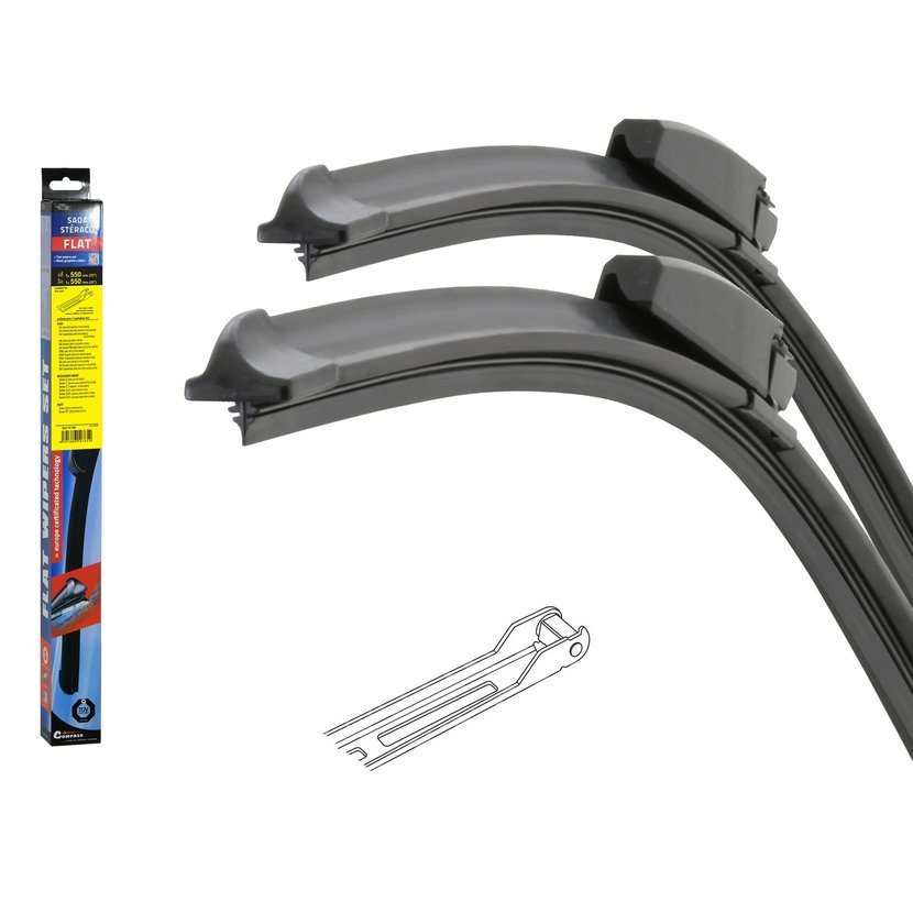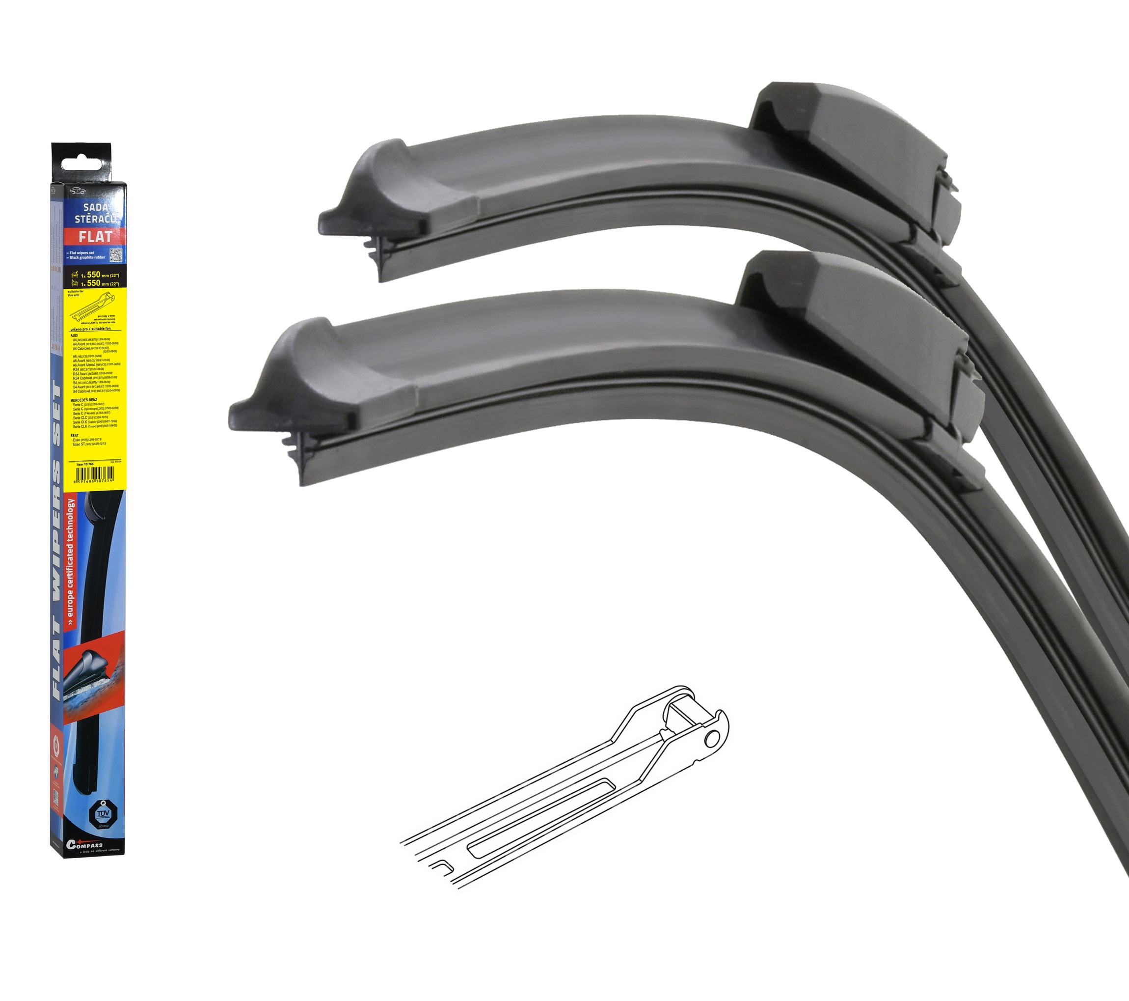 Sada dvou plochých stěračů FLAT (řidič + spolujezdec) se speciálním uchycením. Délky stěračů a systém uchycení na ramínko jsou přizpůsobeny vybraným vozům (viz tabulka použití).