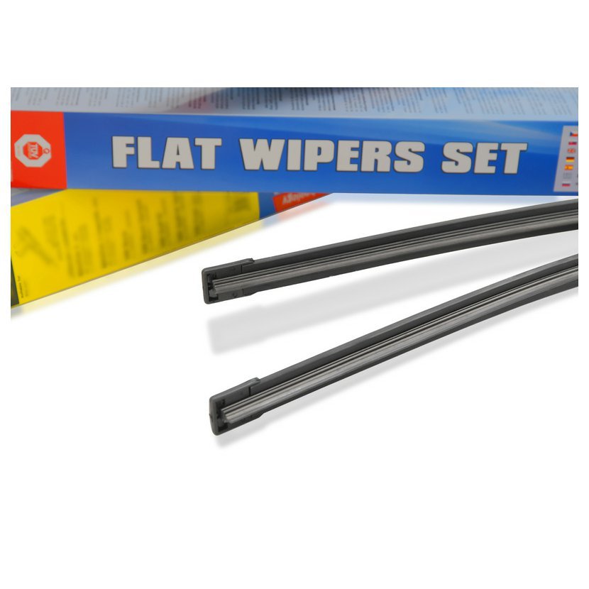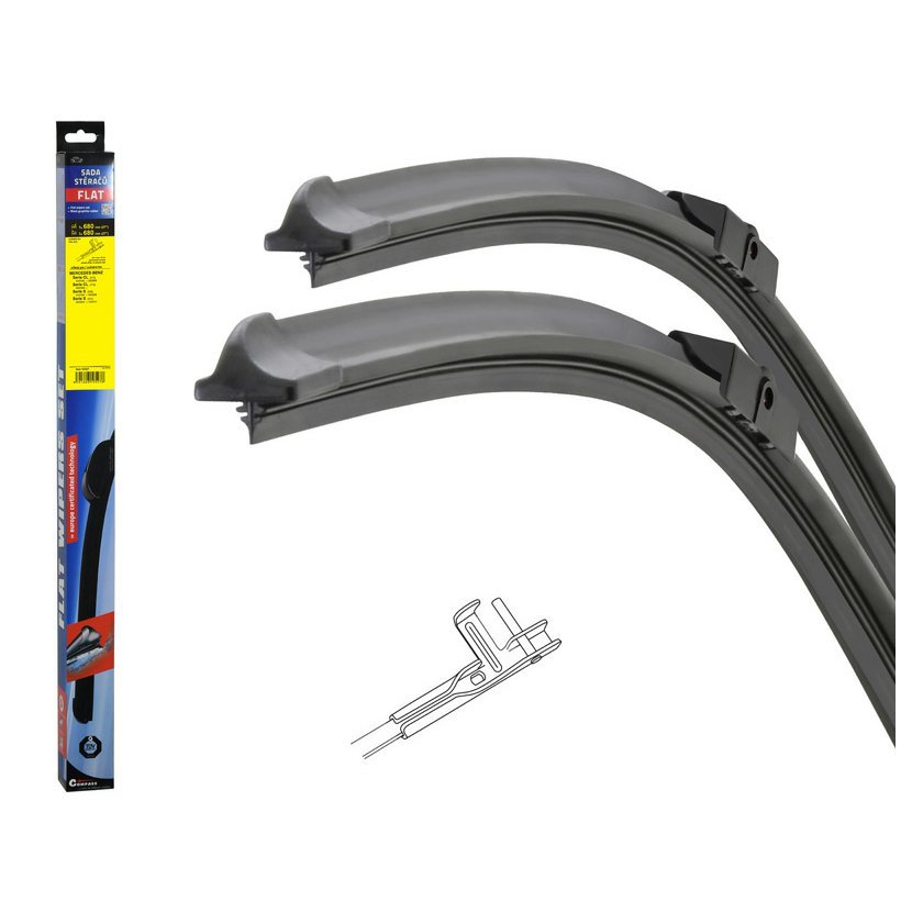Sada dvou plochých stěračů FLAT (řidič + spolujezdec) se speciálním uchycením. Délky stěračů a systém uchycení na ramínko jsou přizpůsobeny vybraným vozům (viz tabulka použití).