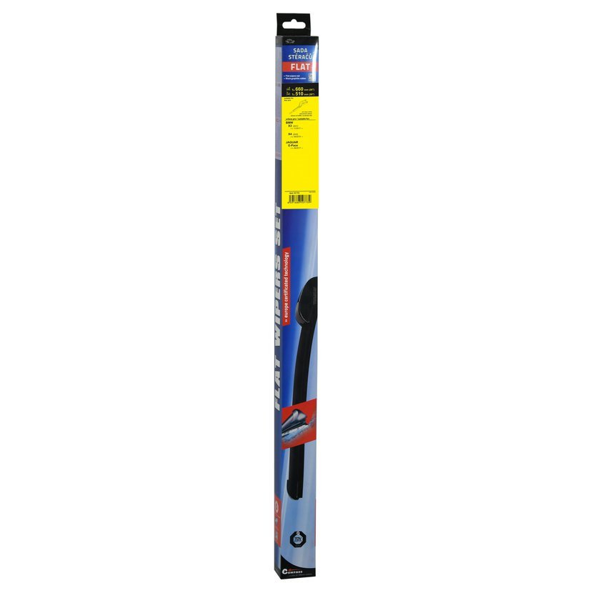 Sada dvou plochých stěračů FLAT (řidič + spolujezdec) se speciálním uchycením. Délky stěračů a systém uchycení na ramínko jsou přizpůsobeny vybraným vozům (viz tabulka použití).