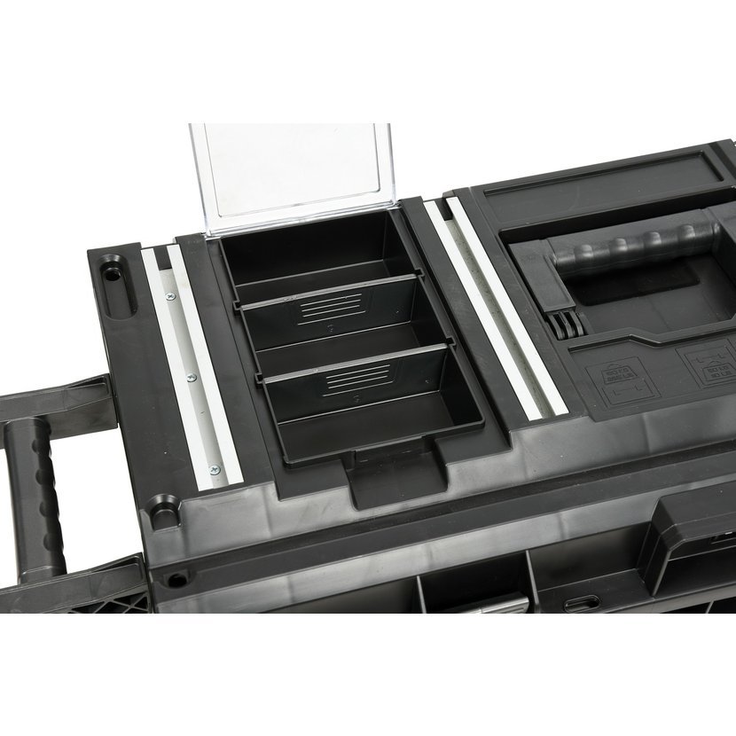Pojízdný plastový kufr se dvěma organizéry ve víku s nastavitelnými přepážkami.