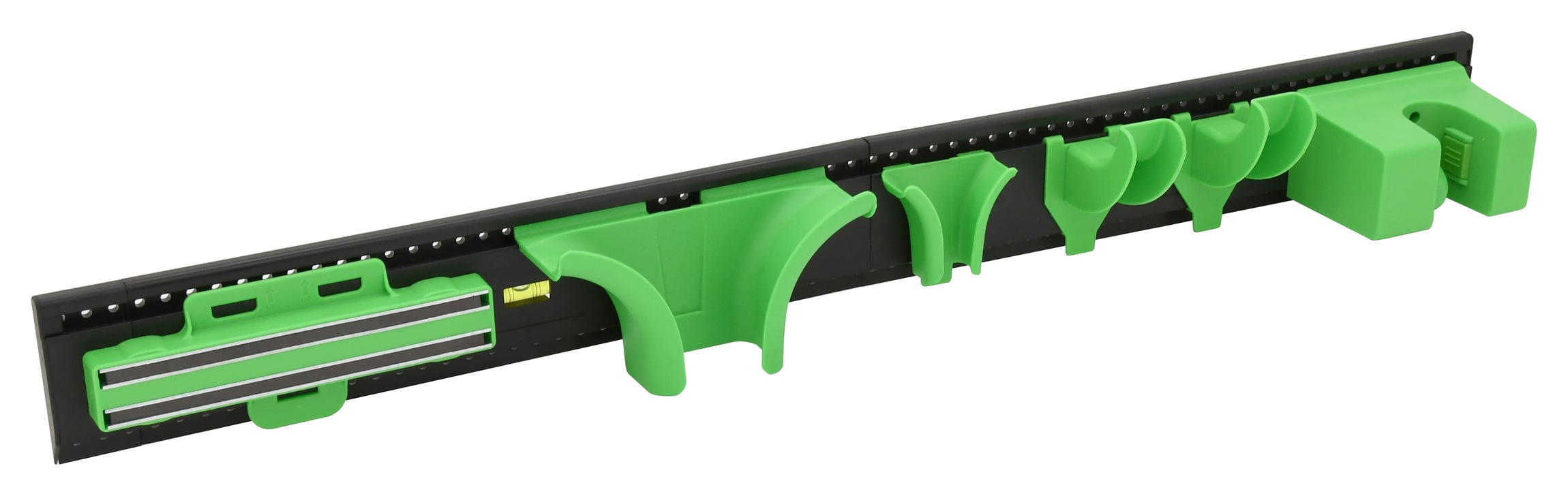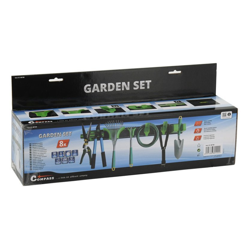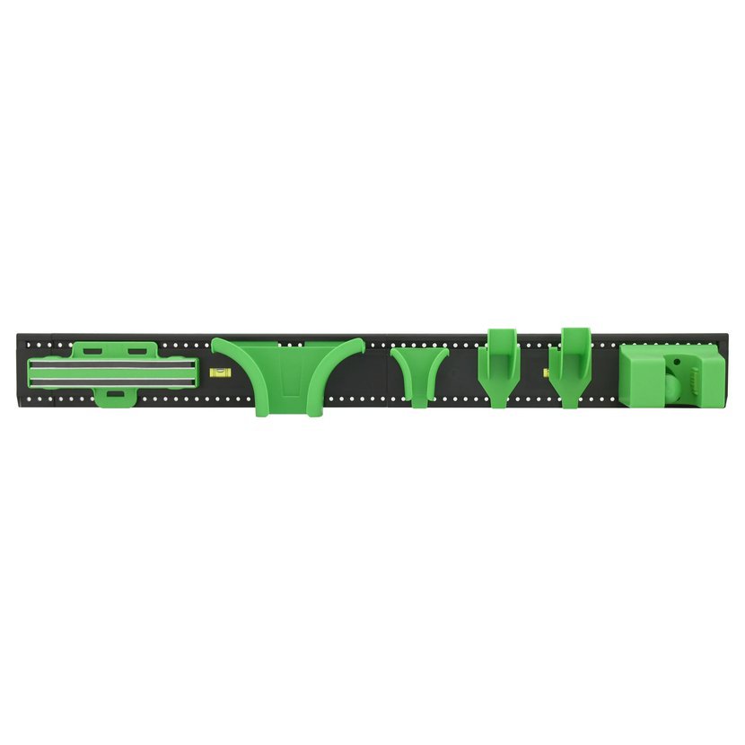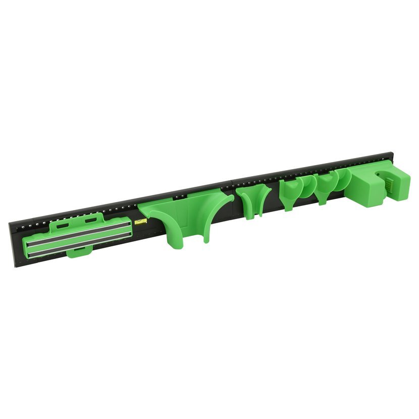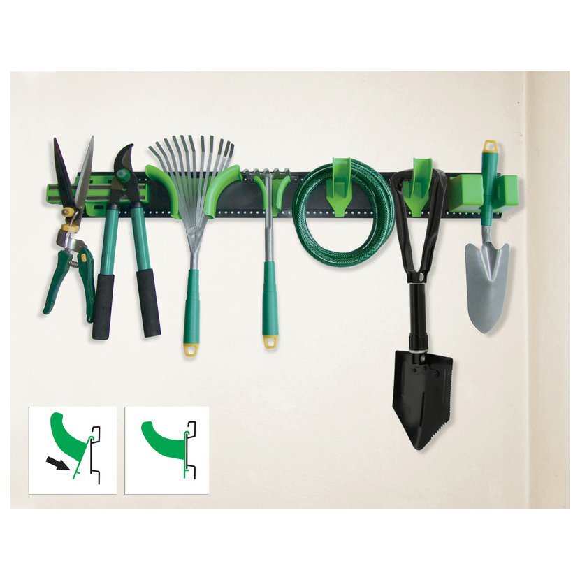 Praktický závěsný systém vhodný pro uspořádání a dlouhodobé uskladnění zahradního náčiní, hadic, lopat a jiných drobností.